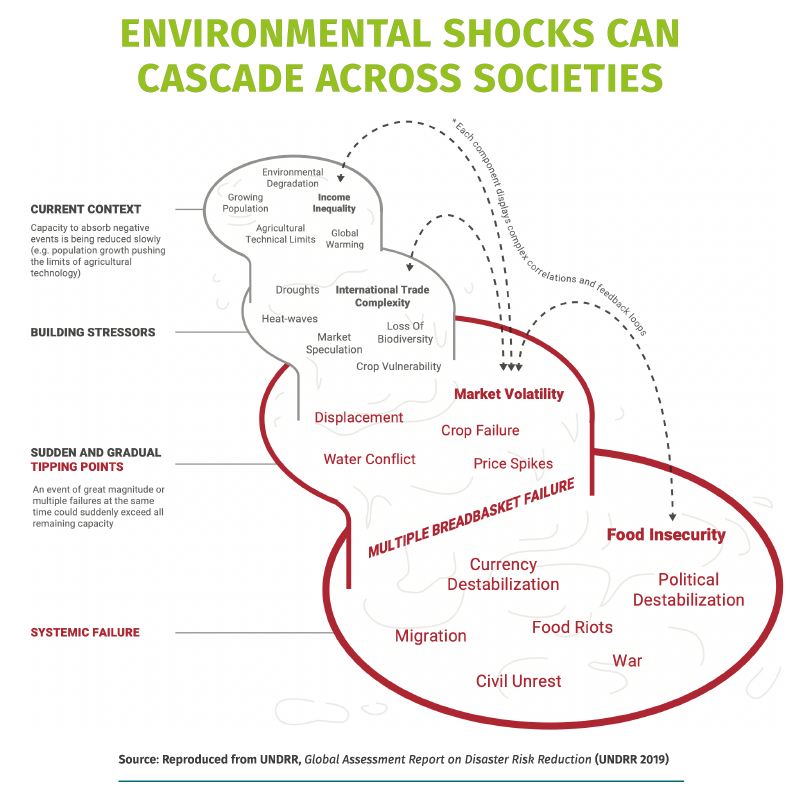 - the cascading consequences for societies, including severe impacts in terms of food security, poverty, economic stability and conflict.